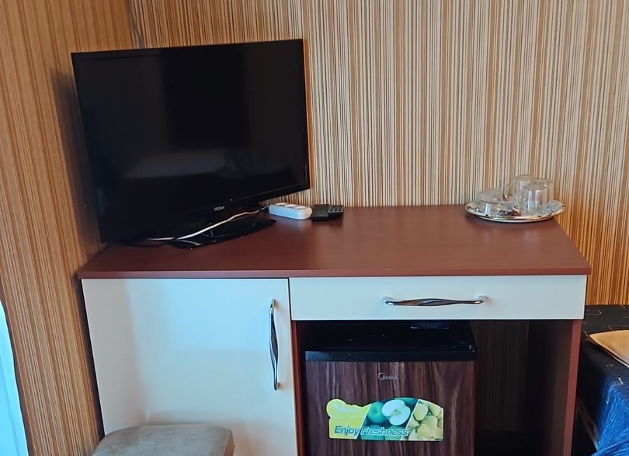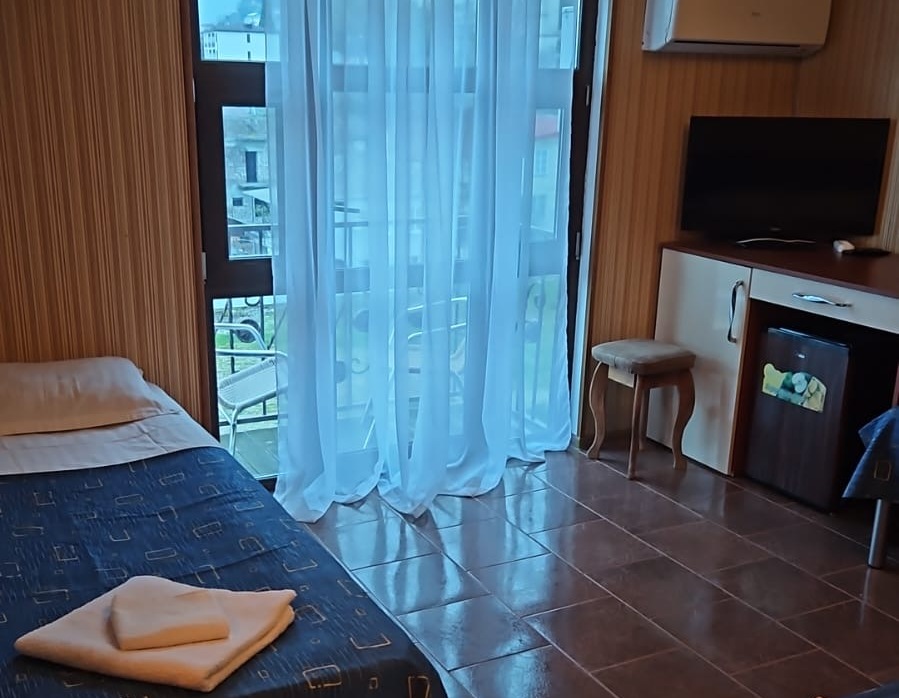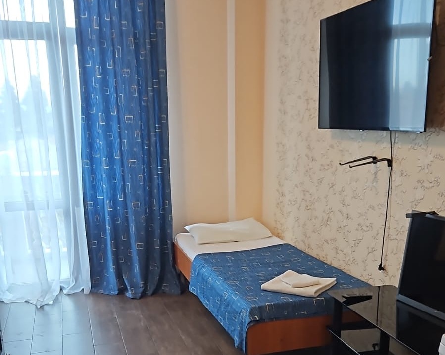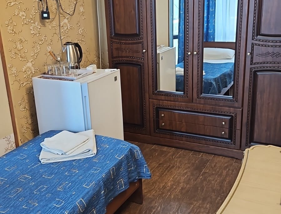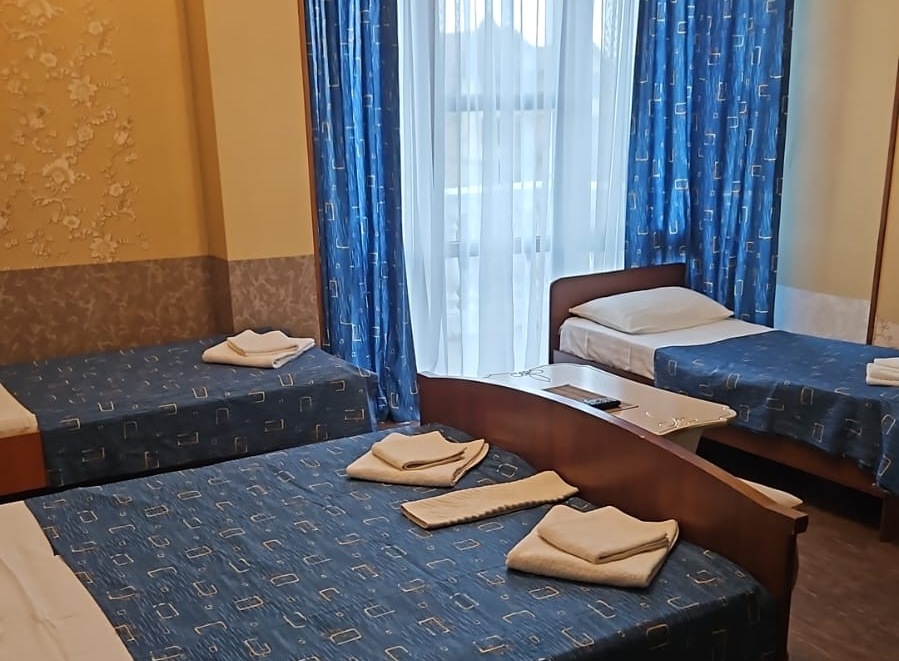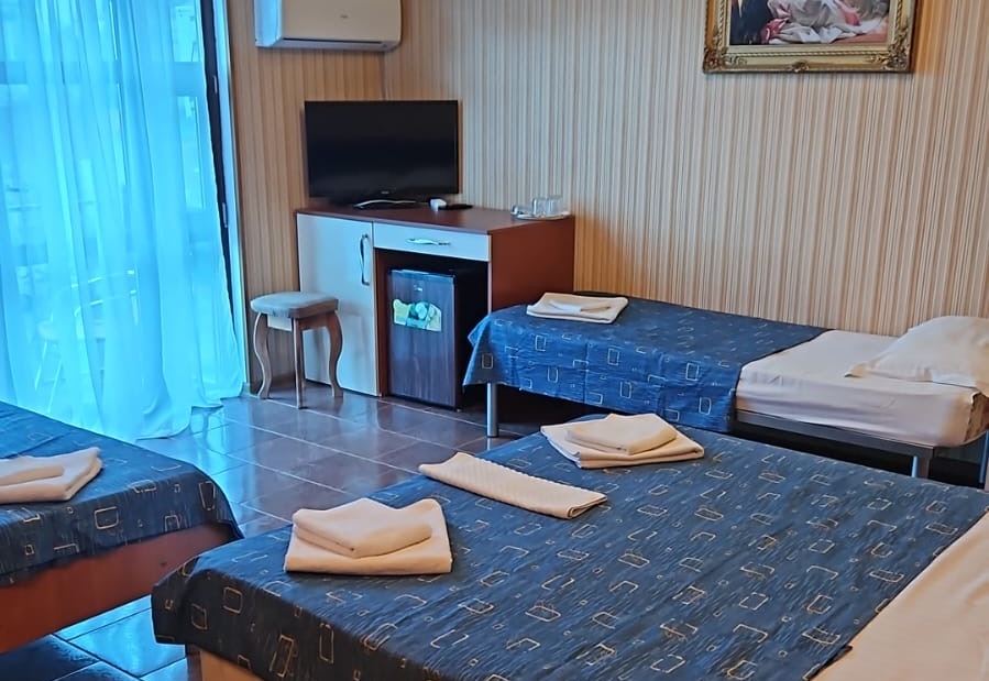 4 осн. места. Мебель: вешалка, зеркало, кровати односпальные (2), кровать двуспальная, прикроватные тумбочки, стол, стул, шкаф. Оборудование: кондиционер, мини-холодильник, телевизор. Санузел: с душем, фен. Сервис: Wi-Fi бесплатно, смена полотенец, смена постельного белья, уборка номера.